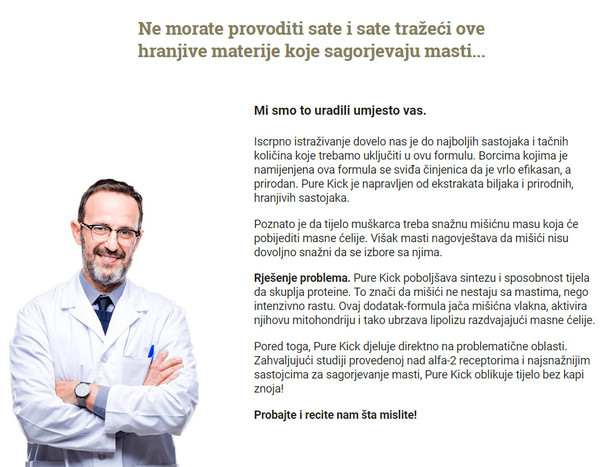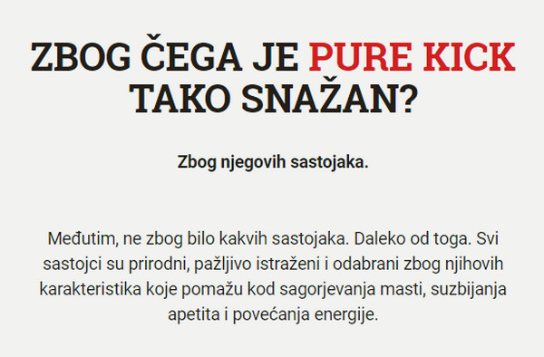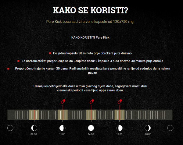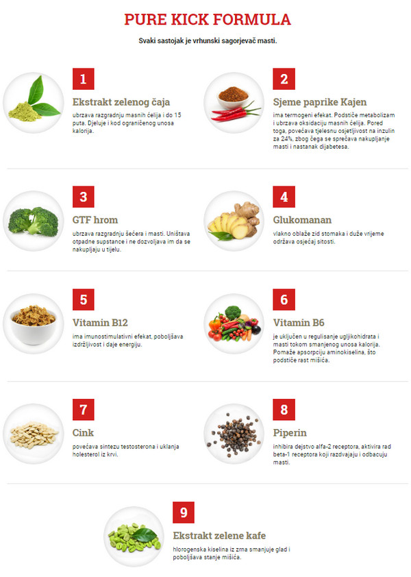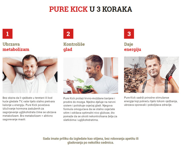 Šta je to Pure Kick? Ovo je jedan od najmoćnijih spaljivača masti. Pure Kick – proizvod prirodnog podrijetla. Aditiv pridonosi razgradnji masti do 40% brže nego bez uporabe. Lijek je univerzalni dodatak pogodan za muškarce i žene, kao i za iskusne sportaše i navijače. Mehanizam djelovanja ovog masnoće je usmjeren na umjereno povećanje tjelesne temperature, što dovodi do ubrzanja metabolizma i na kraju do gubitka težine. U kombinaciji s intenzivnim opterećenjem i prehranom, ovaj lijek je vrlo učinkovit za brzo mršavljenje.