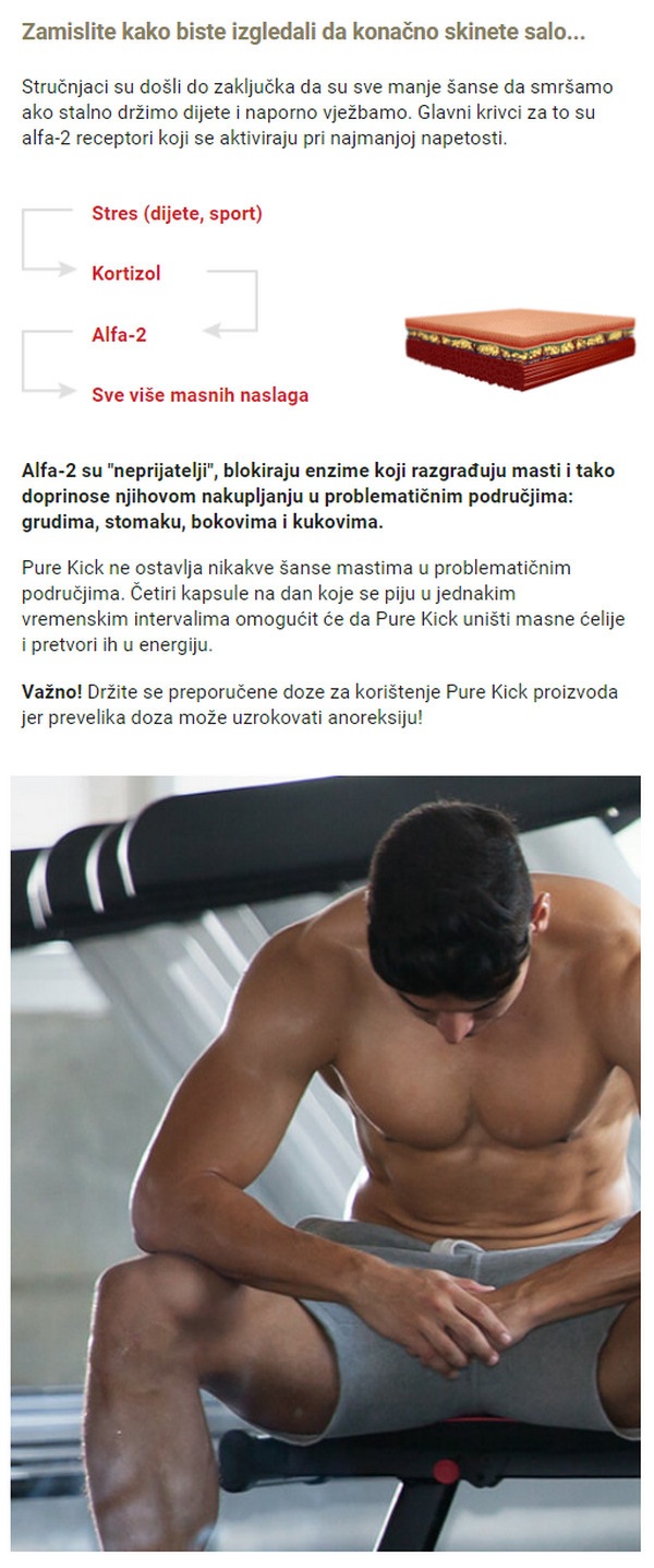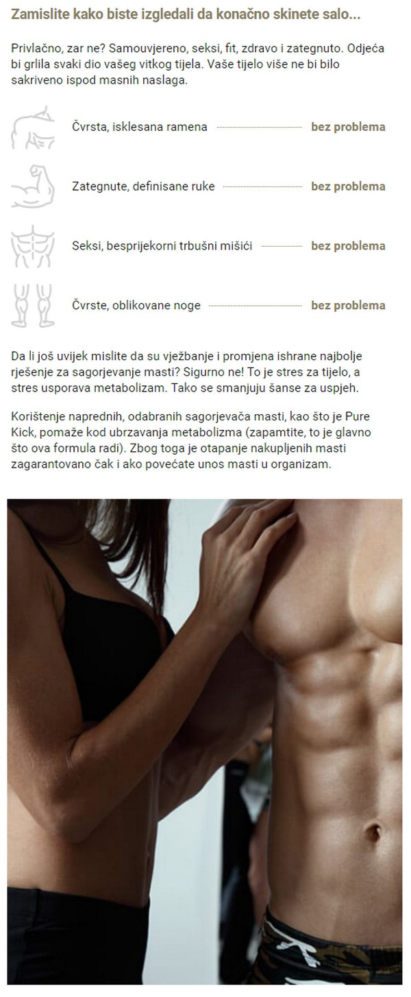 Većina ljudi koji vode ili su odlučni započeti aktivan životni stil obično ne postaju profesionalni sportaši i pobjeđuju rekorde. Njihov je cilj mnogo realniji – osloboditi se dodatnih kilograma i dobiti vitku sportsku figuru. Vitka figura samo sanja mnoge, ali sada je moguće ispraviti nedostatke na slici bez mnogo vremena i novca. Postizanje tog cilja je mnogo lakše nego što se čini, dovoljno je koristiti sagorevač masti Pure Kick. Njihovu učinkovitost potvrđuju i iskustva brojnih profesionalnih sportaša i običnih kupaca koji su zbog učinkovitog i prirodnog sagorijevanja masti uspjeli dobiti vitke i lijepe figure.
